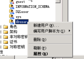 3)删除数据库用户。在企业管理器中,用鼠标右键单击要删除的数据库用户,如数据库student中的数据库用户dbuser,从快捷菜单中选择“删除”命令即可。