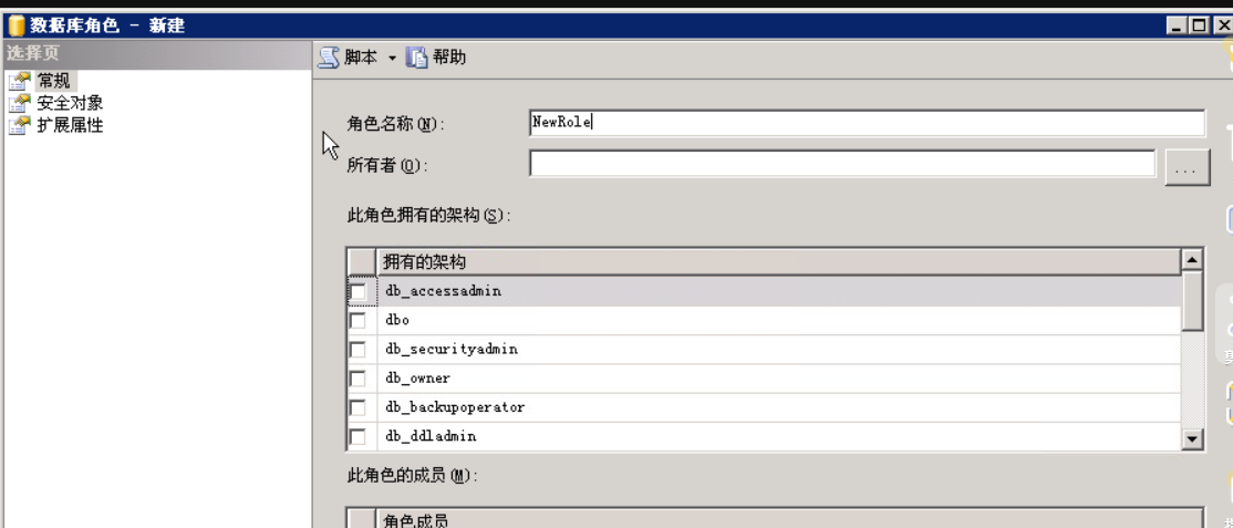 2) 弹出“新建角色”对话框,在角色名称输入框中输入数据库新角色的名称,如NewRole,点击所有者后面的按钮