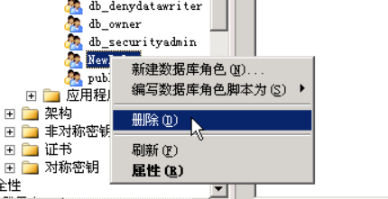 3)删除自定义的数据库角色 在SQL Server Management Studio中,用鼠标右键单击要删除的自定义角色,如NewRole,从弹出的菜单中选择“删除”命令即可删除自定义角色。