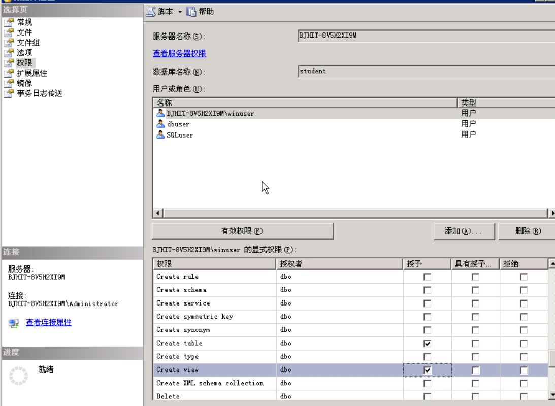 1)进行语句级权限管理:启动SQL Server Management Studio,展开实例数据库,右击student数据库,在弹出的快捷菜单中选择“属性”,然后选择“权限”选项卡。在用户WinUser一栏中,将“创建表”和“创建视图”选中.