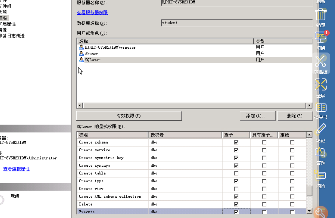 这样的结果是,授予用户WinUser可以在数据库student中创建视图和表。授予用户SQLUser可以在数据库student中进行除创建视图和表以外的所有操作。