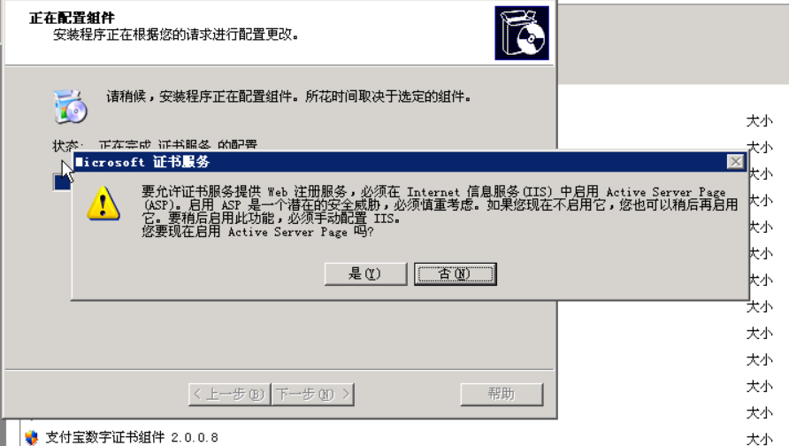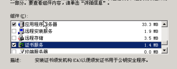 依次点击:“添加删除windows组件”,在组件向导中选中“应用程序服务器”与“证书服务”,先不要点击下一步: