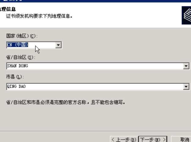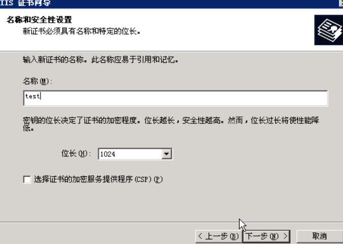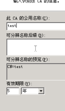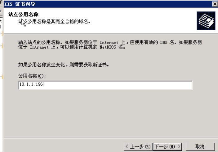 填写公用名称,由于在本环境中没有使用DNS服务器,没有域名因此使用IP地址访问,在公用名称中输入本机的IP地址,如果名称错误,后面过程中会出现问题,因此应仔细核对: