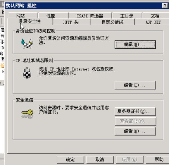 打开默认网站属性,选择“目录安全性”标签,单击“编辑”