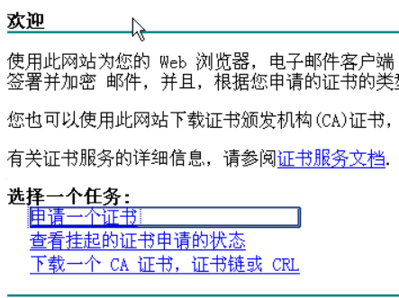 Http://10.1.1.245/certsrv/ (在实验中根据自己情况填写IP),在证书服务页面点击“申请一个证书”