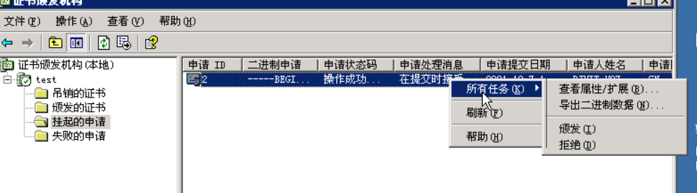 证书的颁发证书的颁发在证书服务器中操作,接下来的操作是证书审核员的角色,切换到CA服务器,点击“开始”>>“管理工具”>>“证书颁发机构”: