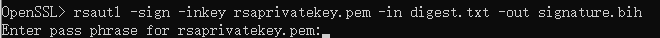 3)利用上述私钥对摘要digest.txt进行签名,生成签名文档signature.bin