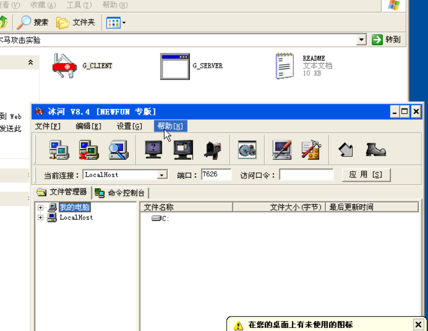 1)PC1端。打开C:\tool\“木马攻击实验”文件夹,在“冰河”文件存储目录下,双击G_SERVER。G_Server是木马的服务器端,即用来植入目标主机的程序。此时,会弹出“Windows安全警报”窗口如图1,点击“解除阻止”,木马的服务器端便开始启动。