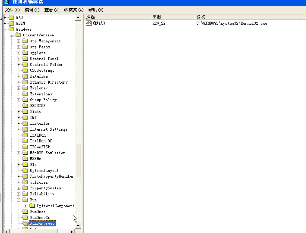在目录中也发现了一个默认的键值C:\WINNT\System32\kernel32.exe,这也是“冰河”木马在注册表中加入的键值,将它删除
