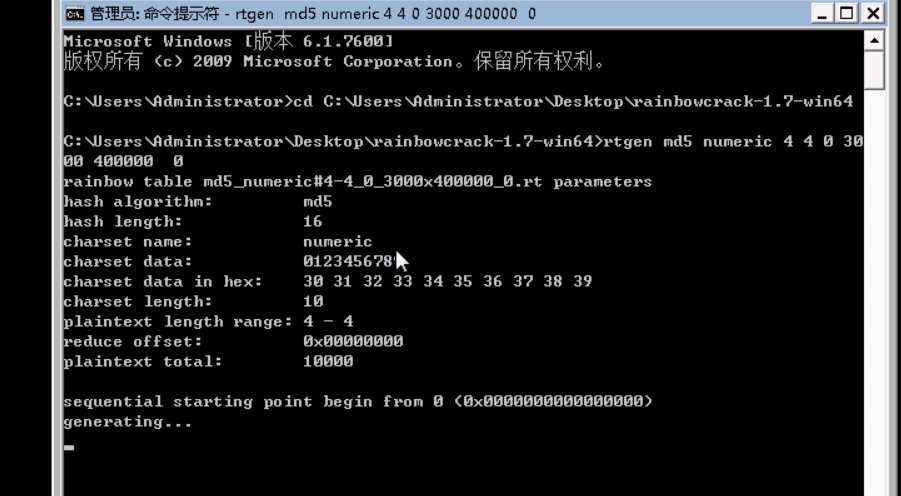实验步骤二:使用给定的彩虹表生成工具RainbowCrack,生成破解四位数字组合MD5值的彩虹表,并对实验一中的MD5字符串进行破解。