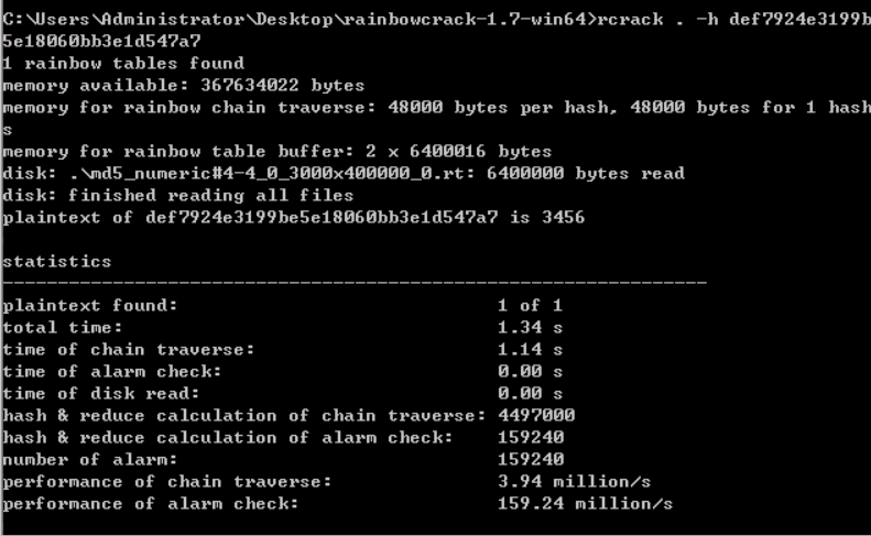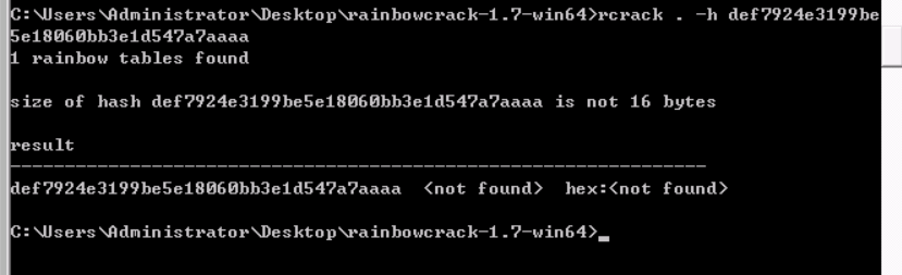 对于单个的哈希值,我们可以直接用rcrack.exe . -h hashnum来进行破解: