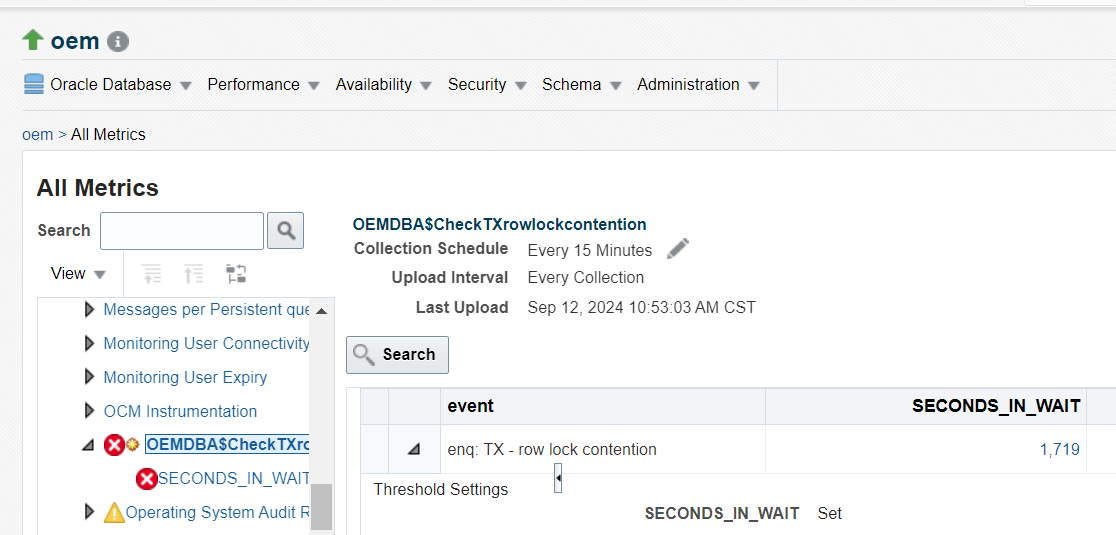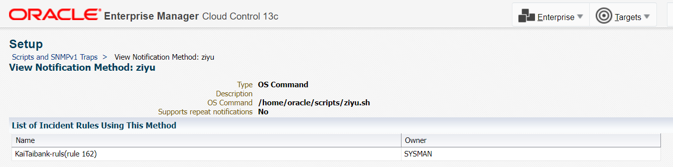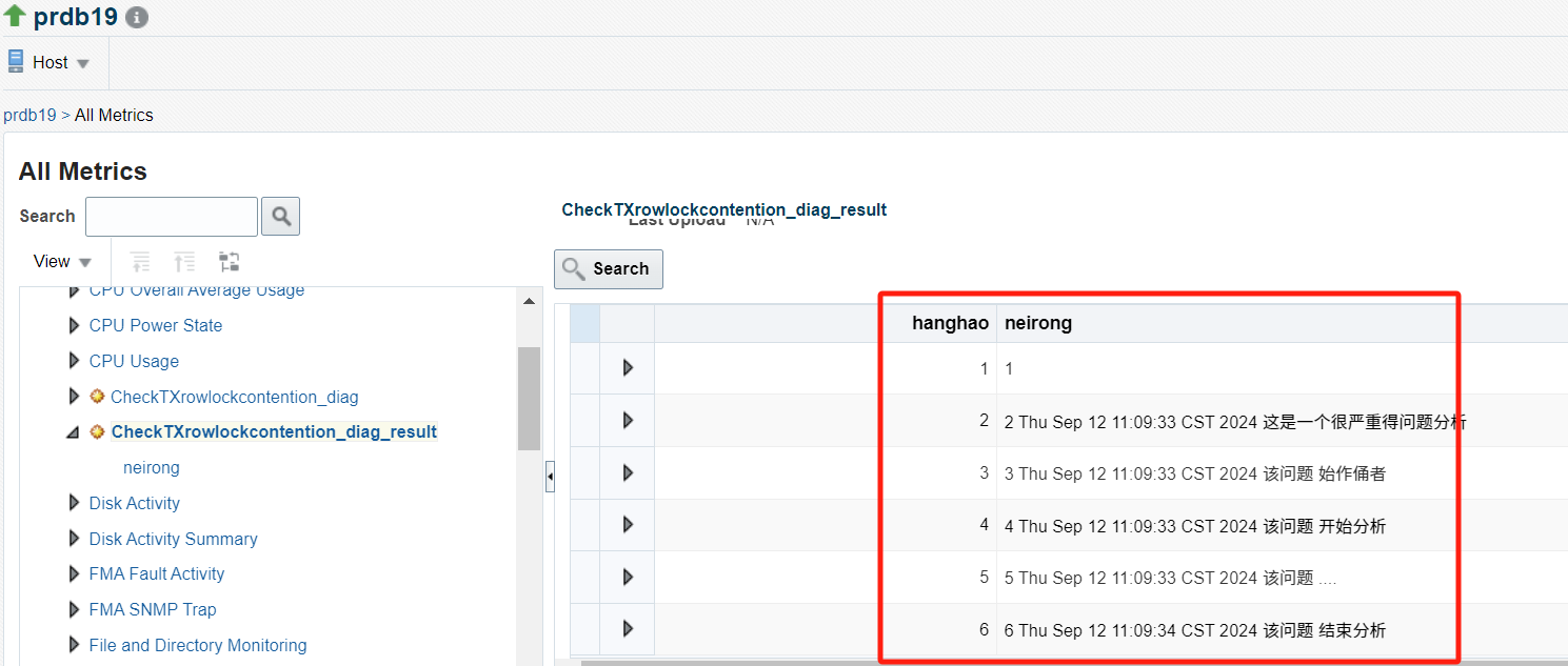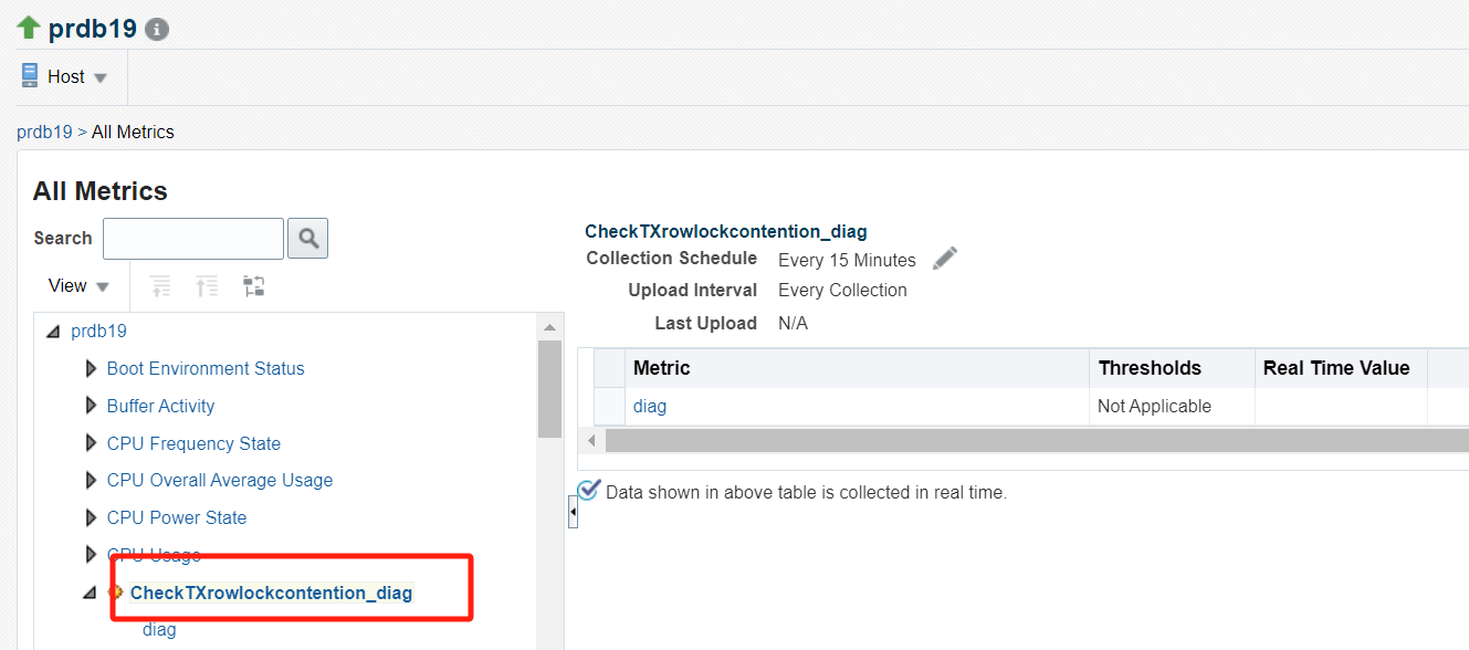 [oracle@prdb19 scripts]$ more ziyu.sh LOG_FILE=/home/oracle/scripts/event.log echo $TARGET_NAME $MESSAGE $EVENT_REPORTED_TIME >> $LOG_FILE /u01/app/oem/middleware/bin/emcli collect_metric -target_type=host -target_name=prdb19 -collection=ME\$CheckTXrowlockcontention_diag > 001 [oracle@prdb19 scripts]$