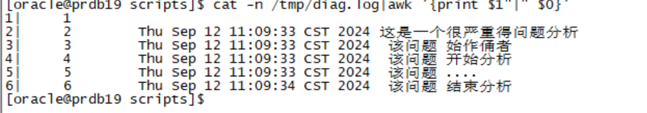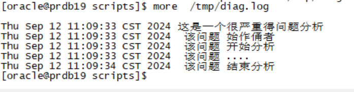 echo "" >> /tmp/diag.log echo `date` "这是一个很严重得问题分析 " >> /tmp/diag.log echo `date` " 该问题 始作俑者 " >> /tmp/diag.log echo `date` " 该问题 开始分析 " >> /tmp/diag.log echo `date` " 该问题 .... " >> /tmp/diag.log echo `date` " 该问题 结束分析 " >> /tmp/diag.log