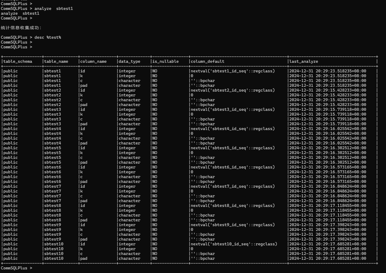收集统计信息,查看表信息