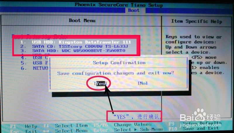 现在就是最后一步了,进行确认。这里点击键盘的F10进行设置的确认保存,这样就成功的将U盘启动设置为了第一启动项。确认如下图所示: