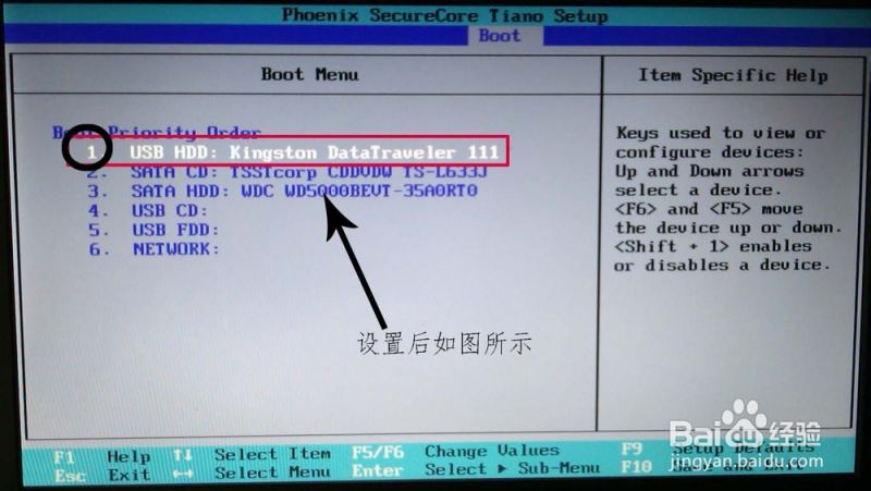 然后找到自己U盘的名字,U盘启动(USB HDD)这一栏,将这一栏移动到做上面,这里使用的是F5/F6进行上下的移动。设置好之后就如下图所示: