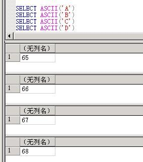 --取出时间的某一部分,和上面的那个差不多 --字符串函数 select ascii(123) as '123',ascii('123') as '"123"',ascii('abc') as '"abc"'