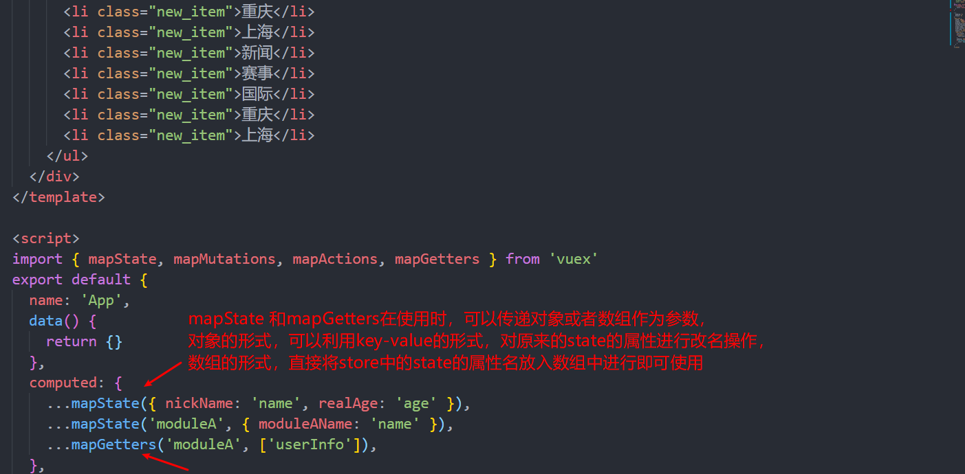 (1)this.$store.state.moduleA.name (vuex默认会将不同的module对应到state对象中保存) (2)...mapState('moduleA',['name']) 或者 ...(mapState('moduleA',{userName:'name'})) -