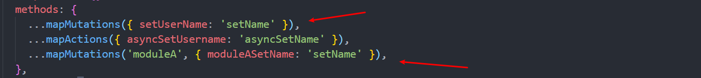 通过从vuex中解构出mapMutations 和mapActions函数,在组件的methods属性中进行映射操作。同上面一样函数中可以传递对象或者数组作为参数。
