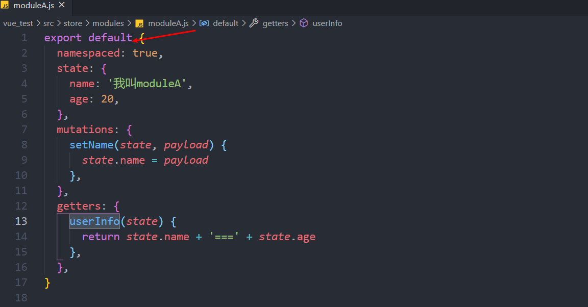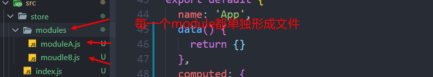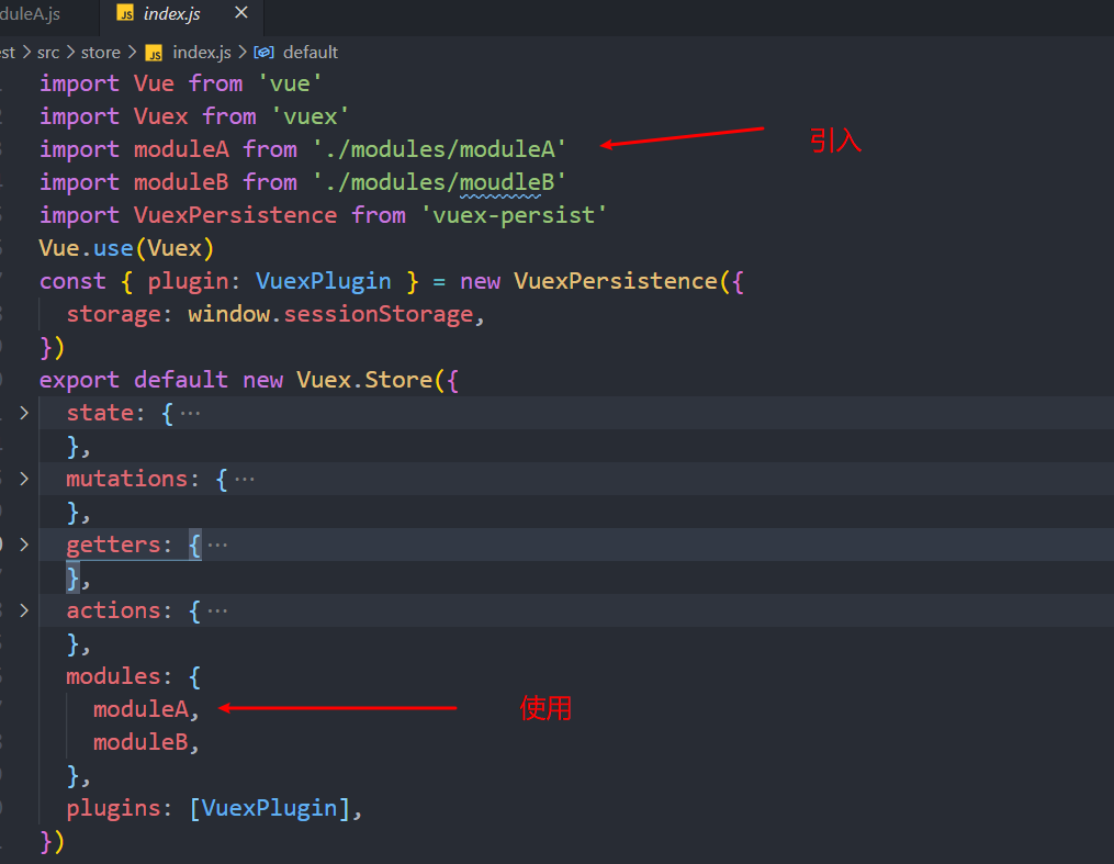 在store文件夹下的index.js中引入moduleA模块