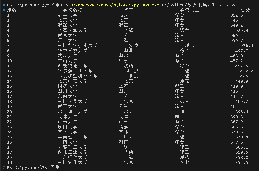print("%-20s%-20s%-20s%-20s%-20s" % ('排名','学校名称','省市','学校类型','总分'))