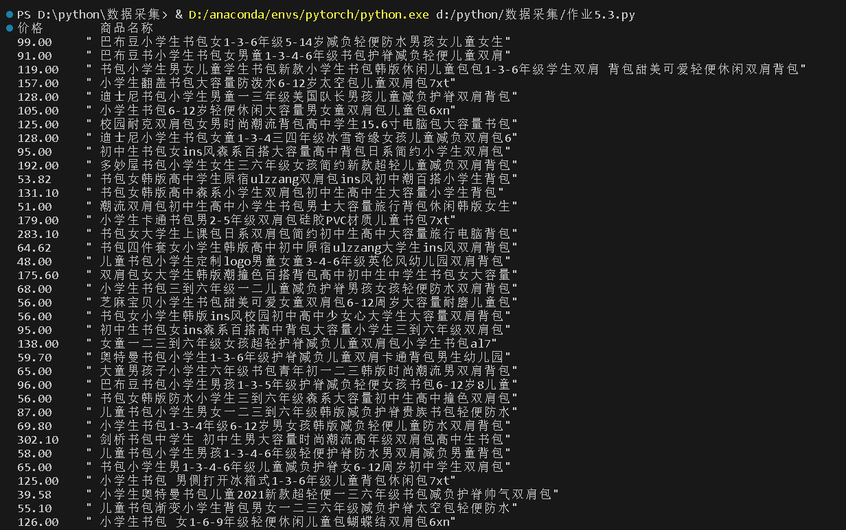o 要求:用requests和re库方法设计某个商城(自已选择)商品比价定向爬虫,爬取该商城,以关键词“书包”搜索页面的数据,爬取商品名称和价格。