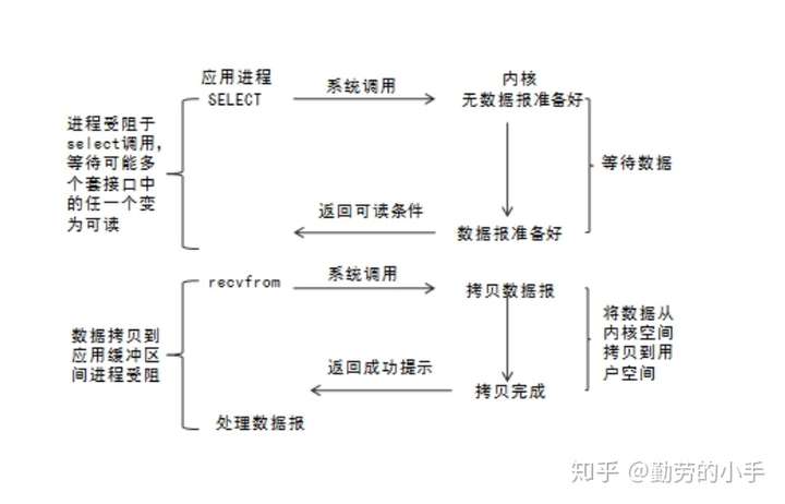 术语描述:进程通过将一个或多个fd传递给select,阻塞在select操作上,select帮我们侦测多个fd是否准备就绪,当有fd准备就绪时,select返回数据可读状态,应用程序再调用recvfrom读取数据。
