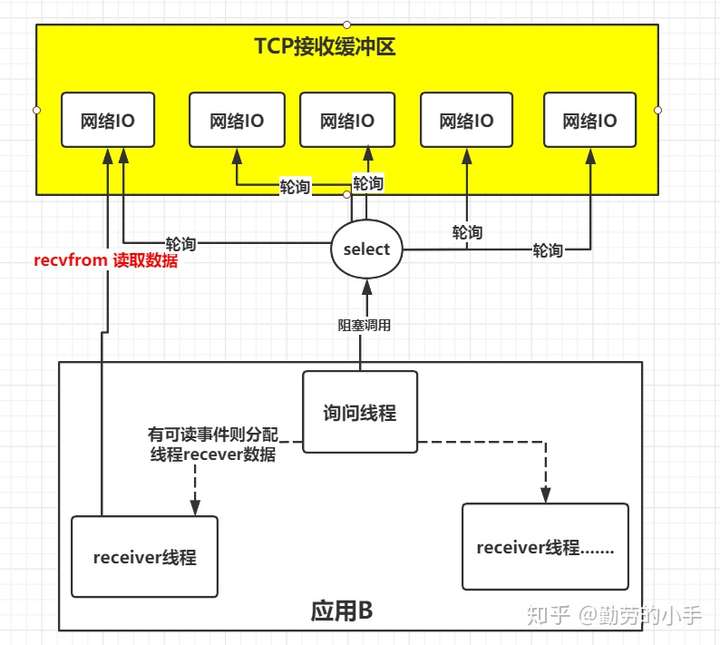 正如上图,IO复用模型的思路就是系统提供了一种函数可以同时监控多个fd的操作,这个函数就是我们常说到的select、poll、epoll函数,有了这个函数后,应用线程通过调用select函数就可以同时监控多个fd,select函数监控的fd中只要有任何一个数据状态准备就绪了,select函数就会返回可读状态,这时询问线程再去通知处理数据的线程,对应线程此时再发起recvfrom请求去读取数据。