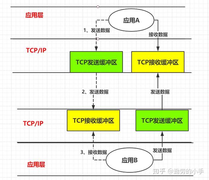 第一步:应用A把消息发送到 TCP发送缓冲区。