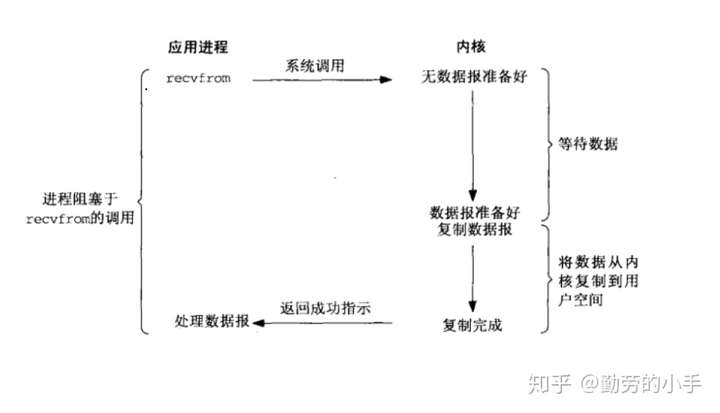 术语描述:在应用调用recvfrom读取数据时,其系统调用直到数据包到达且被复制到应用缓冲区中或者发送错误时才返回,在此期间一直会等待,进程从调用到返回这段时间内都是被阻塞的称为阻塞IO;