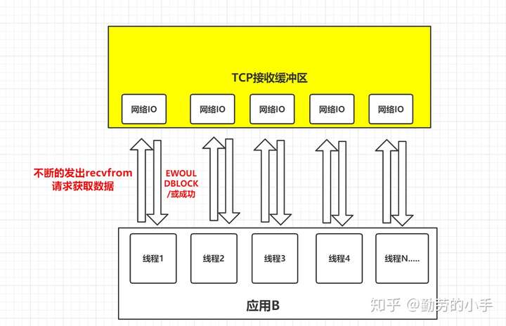 如上图一样,并发情况下服务器很可能一瞬间会收到几十上百万的请求,这种情况下应用B就需要创建几十上百万的线程去读取数据,同时又因为应用线程是不知道什么时候会有数据读取,为了保证消息能及时读取到,那么这些线程自己必须不断的向内核发送recvfrom 请求来读取数据;