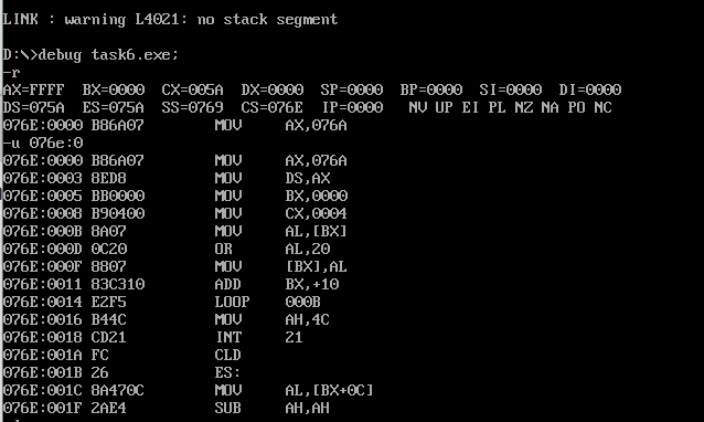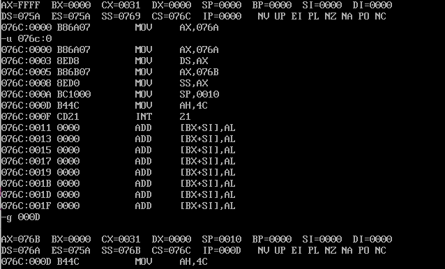 assume ds:data, cs:code, ss:stack data segment db 20 dup(0) data ends stack segment db 20 dup(0) stack ends code segment start: mov ax, data mov ds, ax mov ax, stack mov ss, ax mov sp, 20 mov ah, 4ch int 21h code ends end start