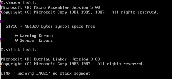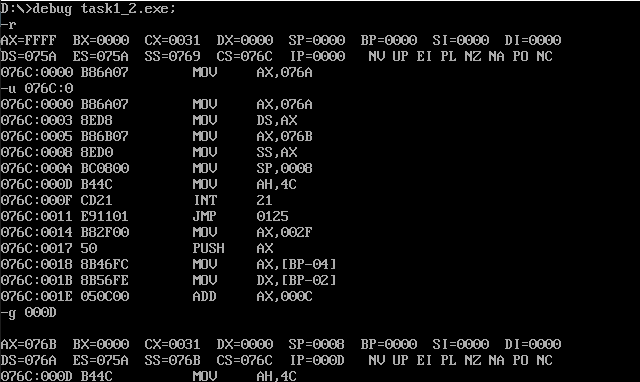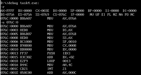 assume ds:data, cs:code, ss:stack data segment db 4 dup(0) data ends stack segment db 8 dup(0) stack ends code segment start: mov ax, data mov ds, ax mov ax, stack mov ss, ax mov sp, 8 mov ah, 4ch int 21h code ends end start