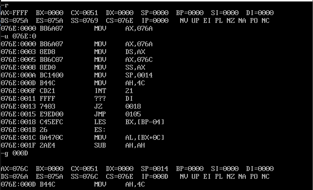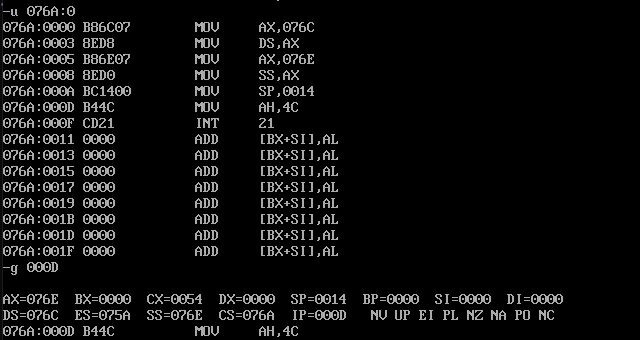 assume ds:data, cs:code, ss:stack data segment db 16 dup(0) data ends stack segment db 16 dup(0) stack ends code segment start: mov ax, data mov ds, ax mov ax, stack mov ss, ax mov sp, 16 mov ah, 4ch int 21h code ends end start