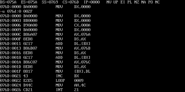 assume cs:code data1 segment db 50, 48, 50, 50, 0, 48, 49, 0, 48, 49 ; ten numbers data1 ends data2 segment db 0, 0, 0, 0, 47, 0, 0, 47, 0, 0 ; ten numbers data2 ends data3 segment db 16 dup(0) data3 ends code segment start: mov dx,0 mov bx,0 mov cx,10 s: mov dx,0 mov ax,data1 mov ds,ax add dl,[bx] mov ax,data2 mov ds,ax add dl,[bx] mov ax,data3 mov ds,ax mov [bx],dl inc bx loop s mov ah,4ch int 21h code ends end start