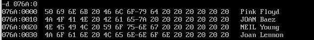 assume cs:code, ds:data data segment db 'Pink Floyd ' db 'JOAN Baez ' db 'NEIL Young ' db 'Joan Lennon ' data ends code segment start: mov ax,data mov ds,ax mov bx,0 mov cx,4 s: mov al,[bx] or al,00100000b mov [bx],al add bx,16 loop s mov ah, 4ch int 21h code ends end start