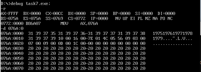 ① 在debug中将执行到line17结束、line19之前,记录此时:寄存器(DS) =076A, 寄存器(SS)=