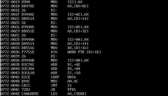 assume cs:code, ds:data, es:table data segment db '1975', '1976', '1977', '1978', '1979' dw 16, 22, 382, 1356, 2390 dw 3, 7, 9, 13, 28 data ends table segment db 5 dup( 16 dup(' ') ) ; table ends code segment start: mov ax,data mov ds,ax mov ax,table mov es,ax mov bx,0 mov si,0 mov di,0 mov cx,5 s: mov ax,[bx] mov es:[si],ax mov ax,[bx+2] mov es:[si+2],ax mov ax,[di+20] mov es:[si+5],ax mov ax,[di+30] mov es:[si+10],ax mov ax,[di+20] mov dx,[di+22] div word ptr [di+30] mov word ptr es:[si+13],ax add di,2 add bx,4 add si,16 loop s mov ah, 4ch int 21h code ends end start