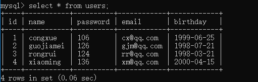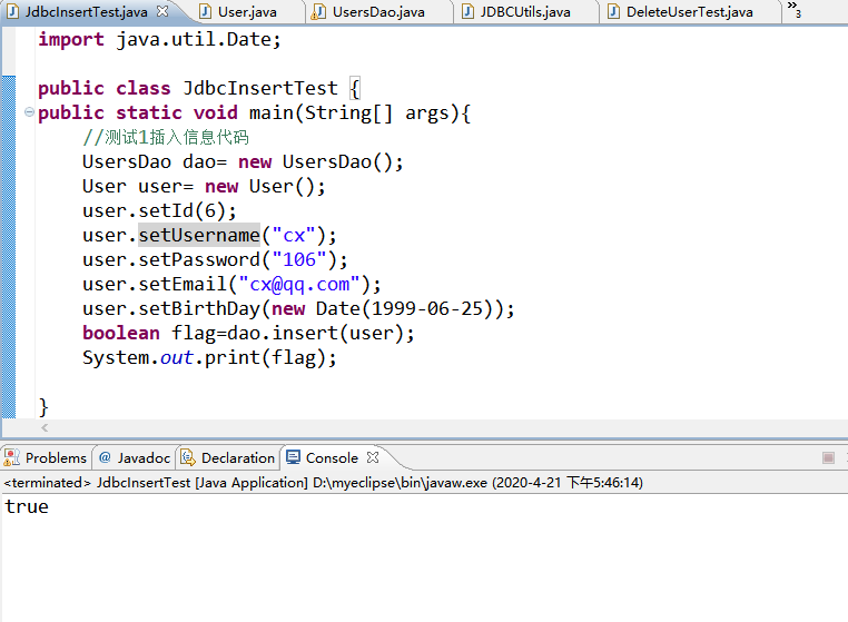 import java.util.Date; public class JdbcInsertTest { public static void main(String[] args){ //测试1插入信息代码 UsersDao dao= new UsersDao(); User user= new User(); user.setId(6); user.setUsername("cx"); user.setPassword("106"); user.setEmail("cx@qq.com"); user.setBirthDay(new Date(1999-06-25)); boolean flag=dao.insert(user); System.out.print(flag); } }