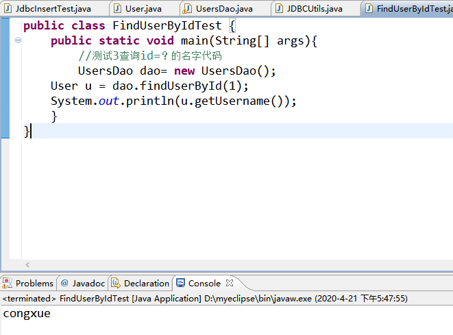 public class FindUserByIdTest { public static void main(String[] args){ //测试3查询id=?的名字代码 UsersDao dao= new UsersDao(); User u = dao.findUserById(5); System.out.println(u.getUsername()); } }