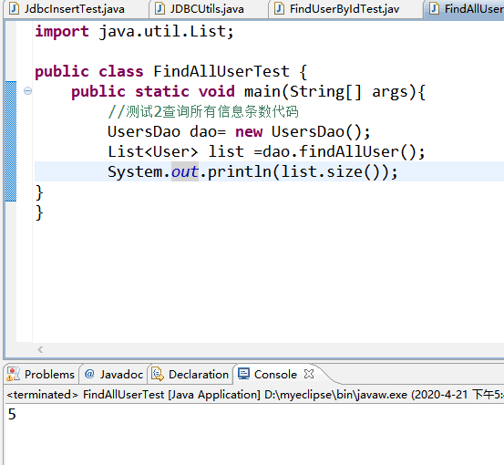 import java.util.List; public class FindAllUserTest { public static void main(String[] args){ //测试2查询所有信息条数代码 UsersDao dao= new UsersDao(); List<User> list =dao.findAllUser(); System.out.println(list.size()); } }