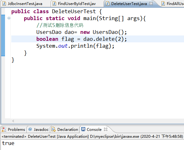 public class DeleteUserTest { public static void main(String[] args){ //测试5删除信息代码 UsersDao dao= new UsersDao(); boolean flag = dao.delete(6); System.out.println(flag); } }