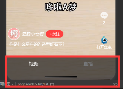 "tabBar": { "custom": true, // 重点!!! "list": [ { "pagePath": "pages/video-list/list", "text": "视频" }, { "pagePath": "pages/live-list/live", "text": "直播" } ] },