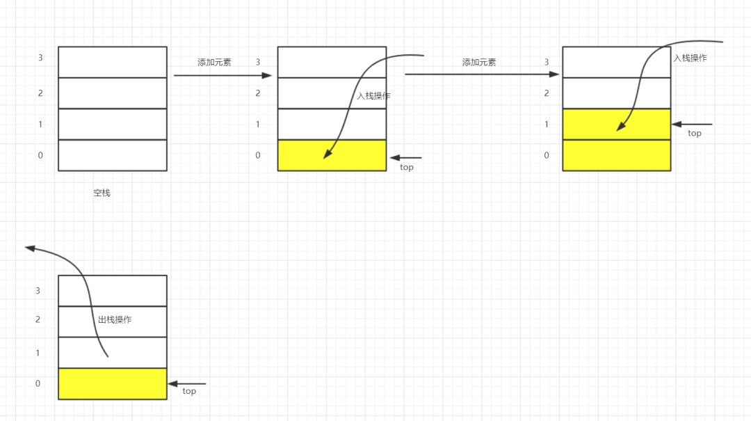 入栈的动作是,当数据来的时候从栈底开始进行储存,当储存的数据top指向的地址从栈底到了栈顶地址,那么意味着本次分配的栈空间都满了。