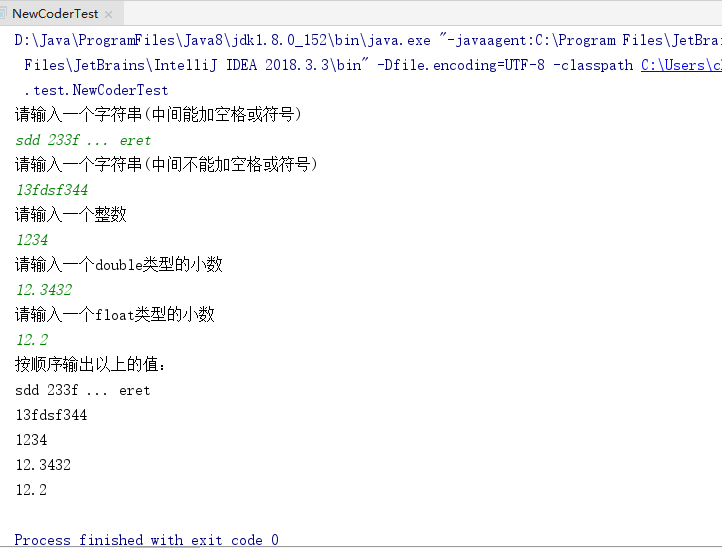public class NewCoderTest { public static void main(String[] args){ Scanner sc = new Scanner(System.in); String str1 = sc.nextLine(); System.out.println(sc.radix()+"str1:"+str1); String str2 = sc.next(); System.out.println("str2:"+str2); int i = sc.nextInt(); System.out.println("i:"+i); long l = sc.nextLong(); System.out.println("l:"+l); Double d = sc.nextDouble(); System.out.println("d:"+d); boolean b = sc.nextBoolean(); System.out.println("b:"+b); } }