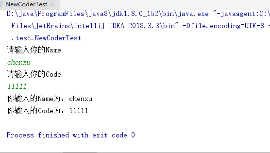 public static void main(String args[]) { Scanner scan = new Scanner(System.in); //构造Scanner类的对象scan,接收从控制台输入的信息 System.out.println("请输入你的Name"); String name = scan.nextLine();//接收一个字符串,可以加除Enter以外的所有符号,包括空格和Tab System.out.println("请输入你的Code"); String code; while(scan.hasNextLine()) {// hasNextLine()方法判断当前是否有输入,当键盘有输入后执行循环 if(scan.hasNextInt()) {// 判断输入的值是否为整数类型,当为整数类型时执行循环 code= scan.nextLine(); System.out.println("你输入的Name为:"+name); System.out.println("你输入的Code为:"+code); break; }else { System.out.println("请输入数字哦!"); code= scan.nextLine(); continue; } } }