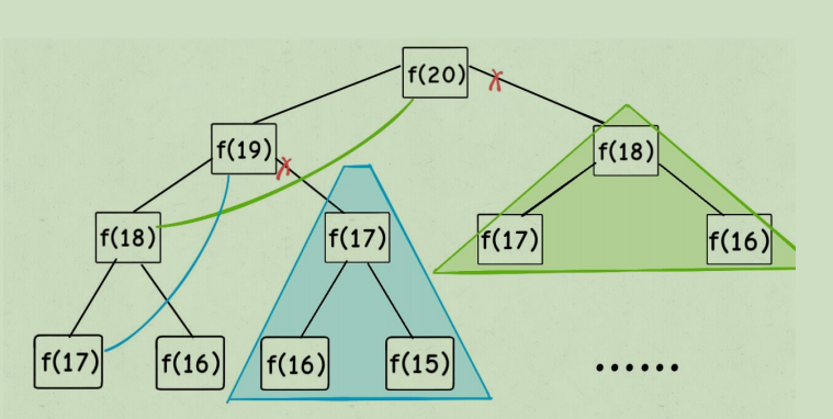所以,这个算法的时间复杂度为 O(2^n),指数级别,爆炸。观察递归树,很明显发现了算法低效的原因:存在⼤量重复计算,⽐如f(18) 被计算了两次,⽽且你可以看到,以 f(18) 为根的这个递归树体量巨⼤,多算⼀遍,会耗费巨⼤的时间。更何况,还不⽌ f(18) 这⼀个节点被重复计算,所以这个算法及其低效。