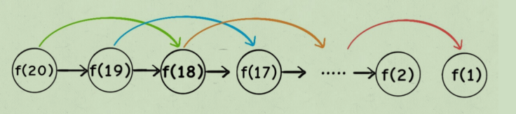 想要计算原问题 f(20) ,我就得先计算出⼦问题 f(19) 和 f(18) ,然后要计算 f(19) ,我就要先算出⼦问题 f(18)和 f(17) ,以此类推。最后遇到 f(1) 或者 f(2) 的时候,结果已知,就