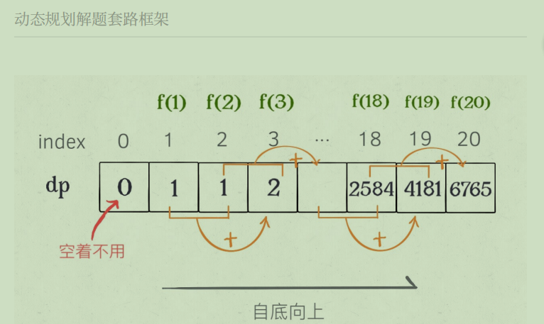 f(n)则必须知道子问题,因此先解决最小的子问题,即从0,1,2…开始int Fibonacci2(int N){ int[] dp = new int[N + 1]; dp[0] = 0; dp[1] = dp[2] = 1; for(int i = 3;i <=N;i++){ dp[i] = dp[i-1] + dp[i-2]; } return dp[N]; }