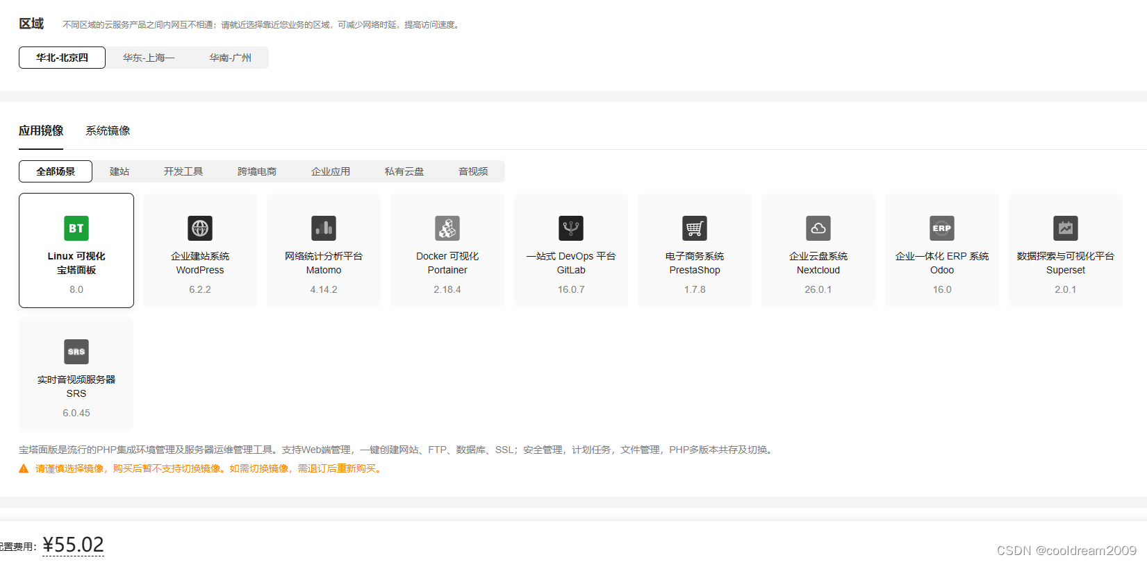 之后会进入华为云耀云服务器L实例的具体产品页面,有应用镜像和系统镜像可以选择,在应用镜像中,还有建站系统Wordpress、Linux可视化宝塔面板、企业一体化ERP系统Odoo、数据探索与可视化平台Superset、Docker可视化运行环境Portainer、企业云盘系统Nextcloud、一站式DevOps平台GitLab、网络统计分析平台Matomo、实时视频服务器SRS等类型,如下所示。